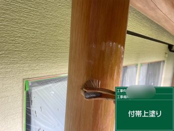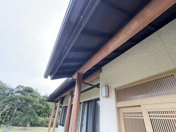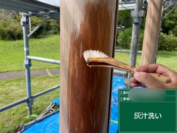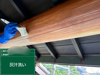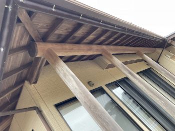 正面入り口の丸桁や柱の木部も灰汁洗いで長年の汚れやシミを落とし、防腐や防虫効果のある保護塗料を塗装しました。